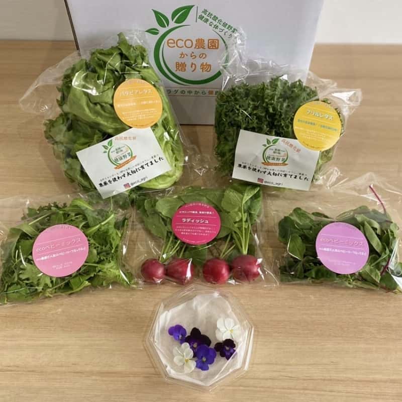 eco農園で育てている野菜の特長は高抗酸化値、栽培時無農薬、鮮度長持ち、安定出荷、味・食感の良さ、サッと洗うだけで食べられる清潔さが挙げられます。