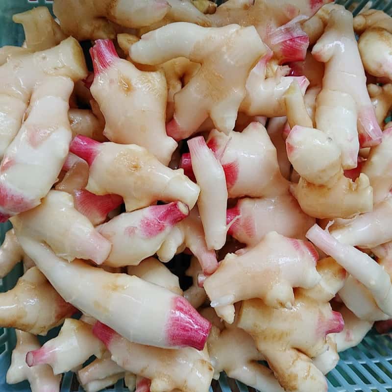 白い生姜は、春先~夏頃に収穫されるハウス栽培の生姜で、爽やかな辛味で水分も多く主にサラダや酢の物の生食や甘酢漬け・紅ショウガなどに最適です。