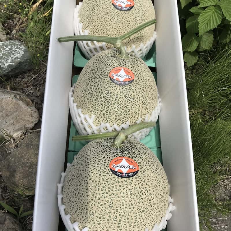 当ファームのメロンは大ぶりのメロンが多いため、こちらのお箱に4玉しか入りませんが、その日の収穫状況により5玉入る場合もございます。合計の重量は同じ、もちろん甘さも同じです。玉数は、当ファームで選ばせていただきます。