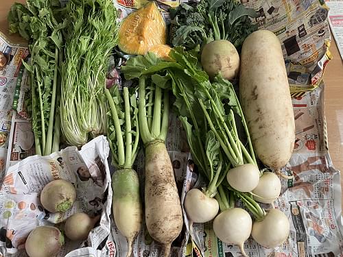じゃがいも、小かぶ、聖護院かぶ、紅芯大根、白菜、信州地大根、人参、ラディッシュ、九条ネギ、かぼちゃ