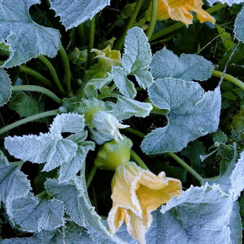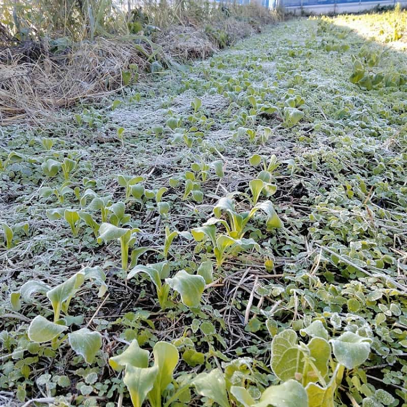 朝は霜がおり、野菜たちも霜にあたっています
