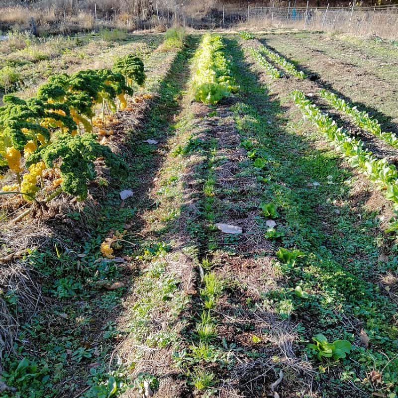 写真の左手前からケール、中央手前がまだ小さいですがイタリア野菜のエルバステラとカブ、右がチンゲンサイ。