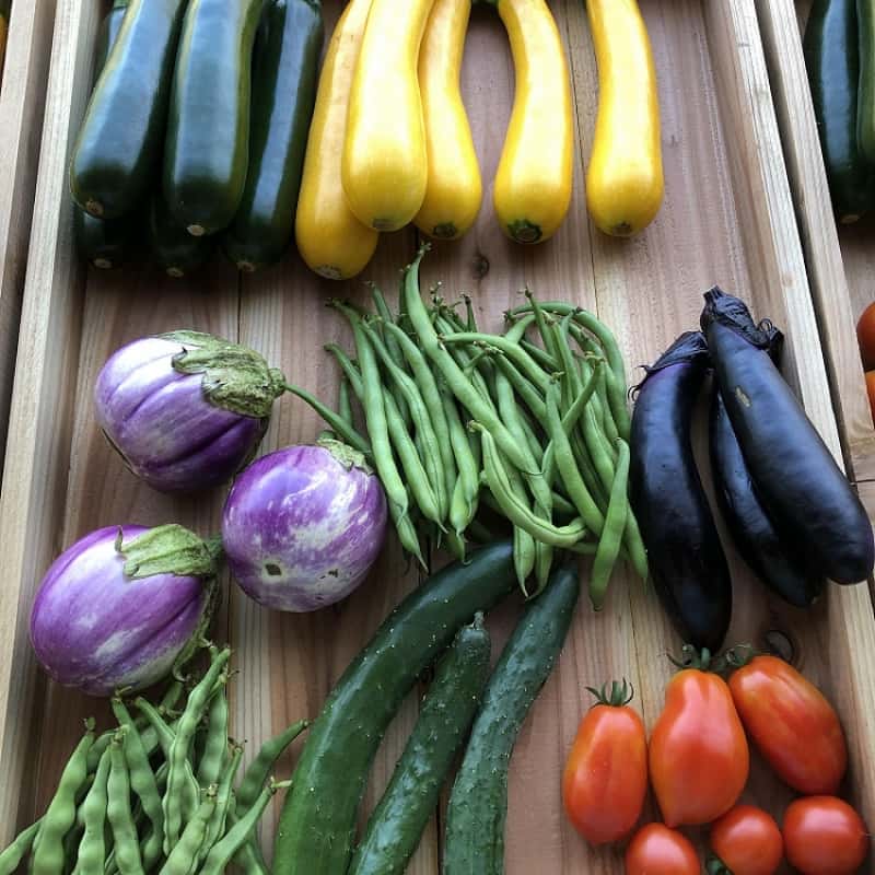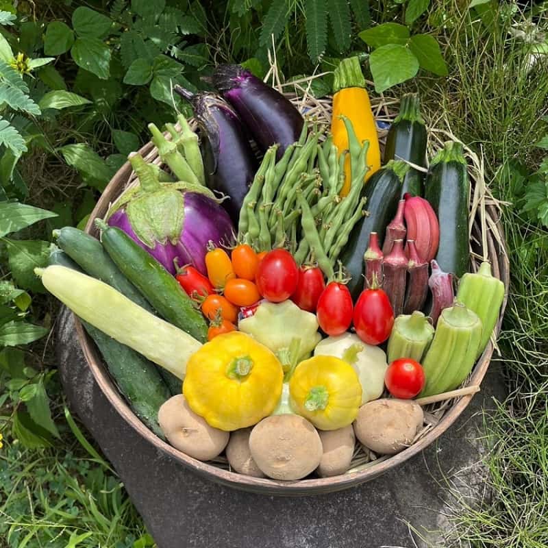 ズッキーニ、ナス、いんげん、人参、聖護院かぶ、小かぶ、ムラサキかぶ、緑大根、大根、さつまいも、ちんげんさい、水菜、山東白菜、かぼちゃ、バターナッツかぼちゃ、ケール、にんにく、ハーブ(ディル、スープセロリ、パセリなど)