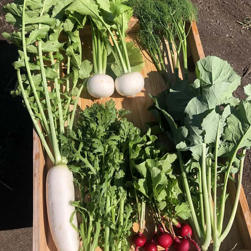 かぶ、レタス類、春菊、のらぼう菜、ディル、細ネギ、にんにく、じゃがいも、UFOズッキーニ、小玉ネギ、コールラビなど