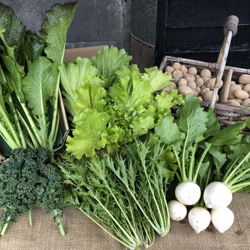 ズッキーニ、ナス、いんげん、人参、聖護院かぶ、小かぶ、ムラサキかぶ、緑大根、大根、さつまいも、ちんげんさい、水菜、山東白菜、かぼちゃ、バターナッツかぼちゃ、ケール、にんにく、ハーブ(ディル、スープセロリ、パセリなど)