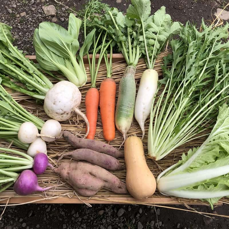 じゃがいも、小かぶ、聖護院かぶ、紅芯大根、白菜、信州地大根、人参、ラディッシュ、九条ネギ、かぼちゃ