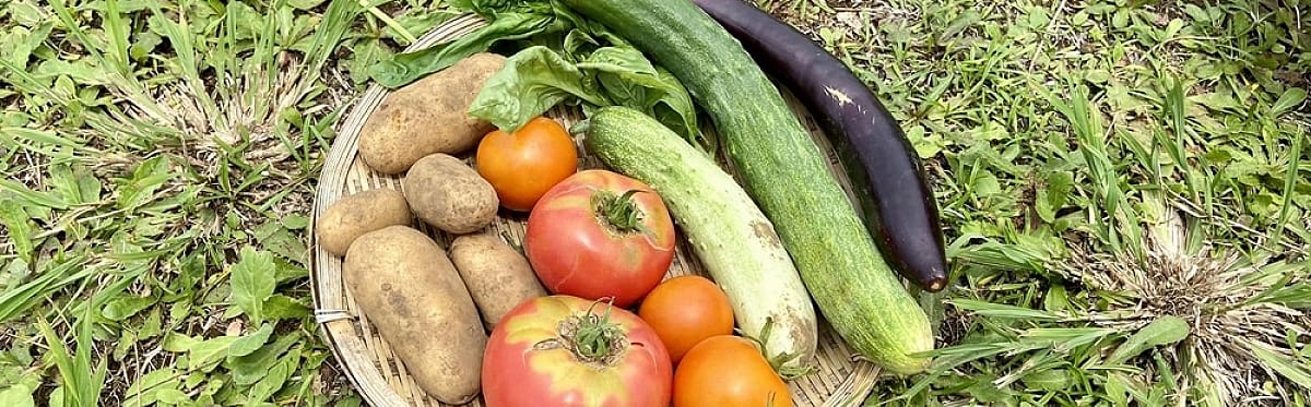 菊芋、ベニハルカ、フクムラサキ、かぼちゃ、スイカ、トマト、きゅうり、インゲン