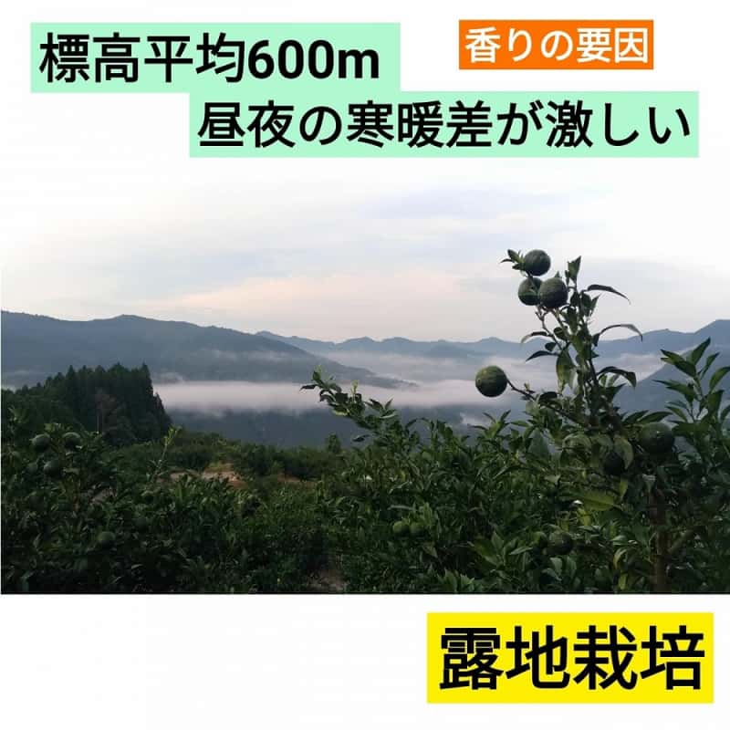 西米良村は宮崎県の九州山脈ど真ん中あたりに位置しており、標高が高く昼夜の寒暖差が激しいため、青柚子の香りにはご好評頂いております。