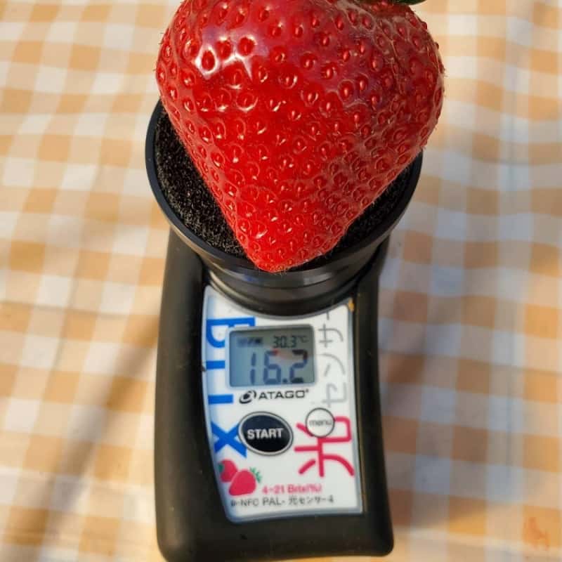 いちごの平均糖度が10度前後という事を鑑みると、当園の最新ITデータに基づいた最新農法がいかに秀でているのかを物語っています。