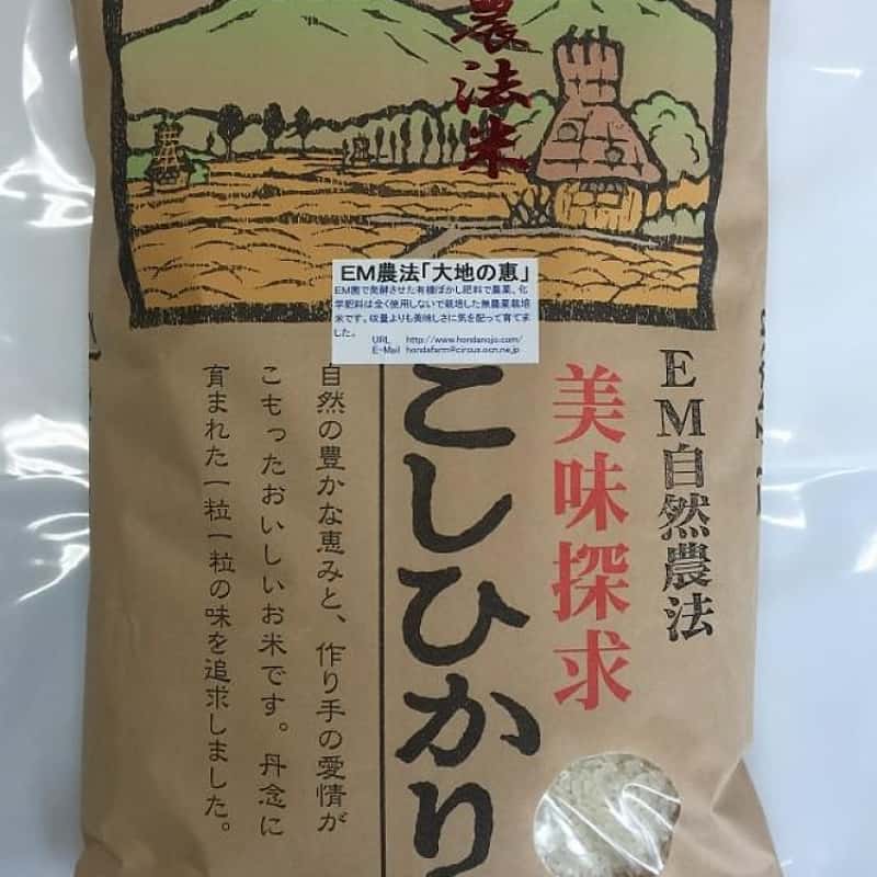 農薬、化学肥料を全く使用しないで有用微生物EMを使用した農法でJAS認証前の圃場でとれたお米です。