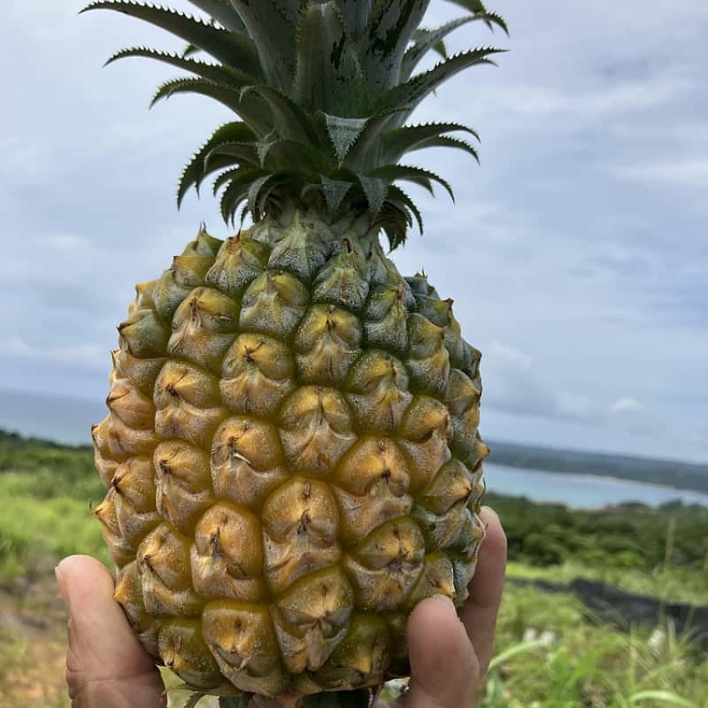 7月に入って、やんばるの太陽をたっぷり浴びたスナックパインの収穫がスタートしました。海が見える南向きの畑で育ち、とびきり甘い状態でお届けしています 。