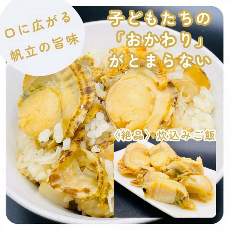 炊きあがったご飯に、帆立を良くほぐしてお召し上がりください。
