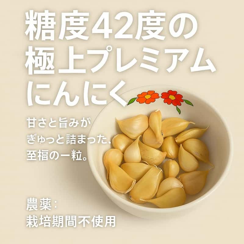 糖度42度のプレミアムニンニク。 洗練された香ばしさが、料理にひときわ深い味わいを与えます。特別な一皿に、ぜひお使いください。 価格抑えるためにクリックポストでの発送になります。 鮮度保護のため多少土がついています。