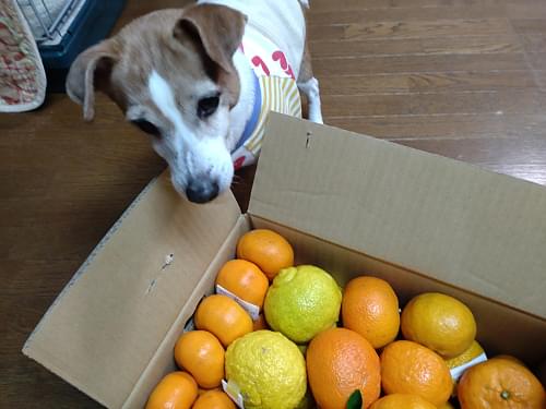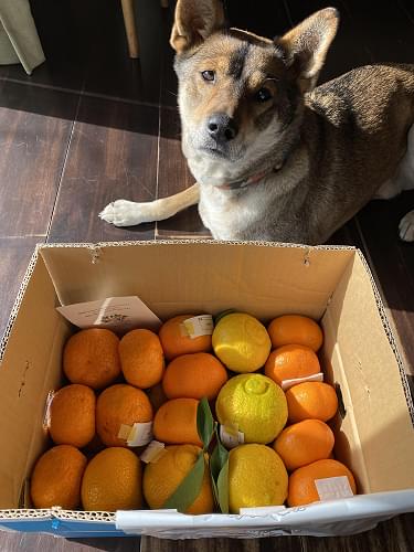 茜ちゃんたびたび届くこの箱何かしらねー📦🍊🐶今日は寒いですが是非春の柑橘盛り合わせで季節をお楽しみくださいませ🌸いつもご贔屓にしてくださりありがとうございます。