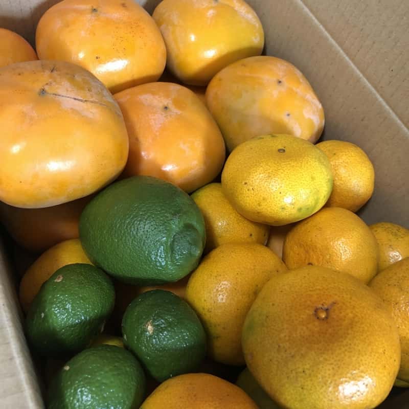 箱込みで、柿2.5kg、極早生みかん2.5kg、レモン1〜3個、青柚子2〜5個のセットです。