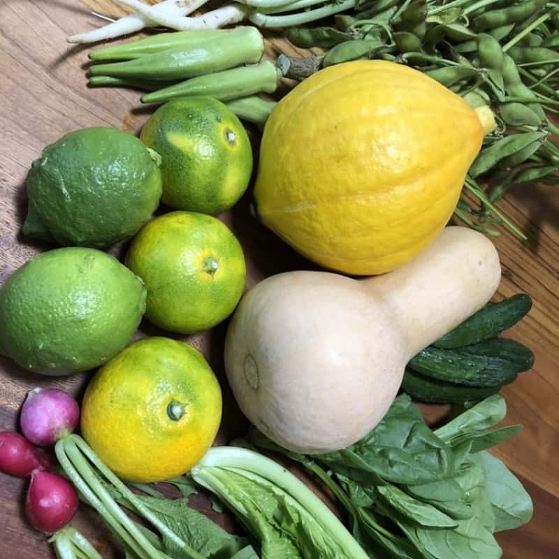 現在収穫中の野菜は極早生みかん、レモン、コリンキー、バターナッツ、枝豆、オクラ(白、赤、緑)、ラディッシュ、紫水菜、キュウリ、ほうれん草、小松菜、みょうがです。