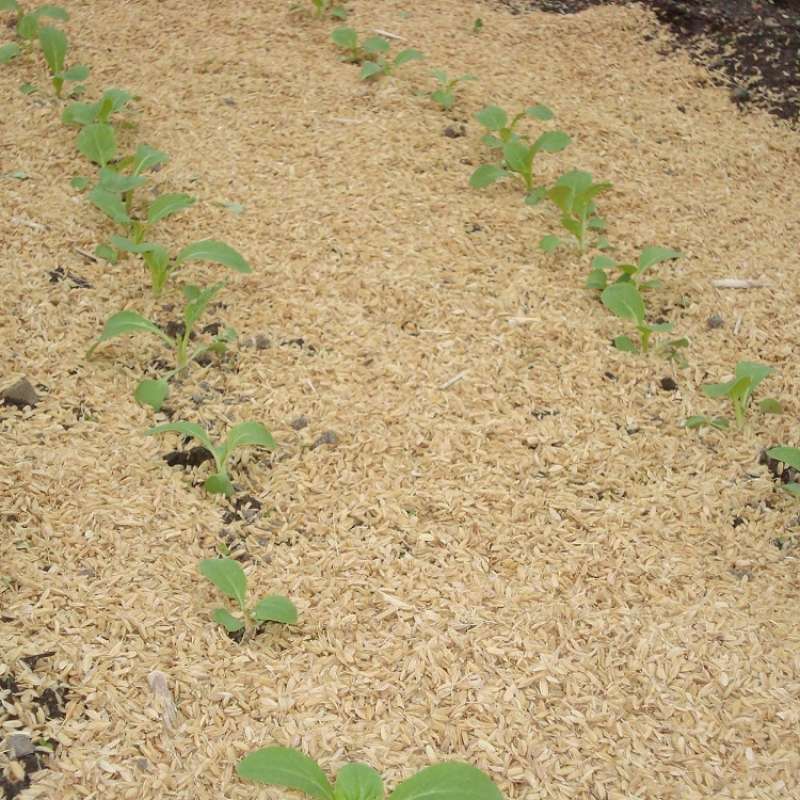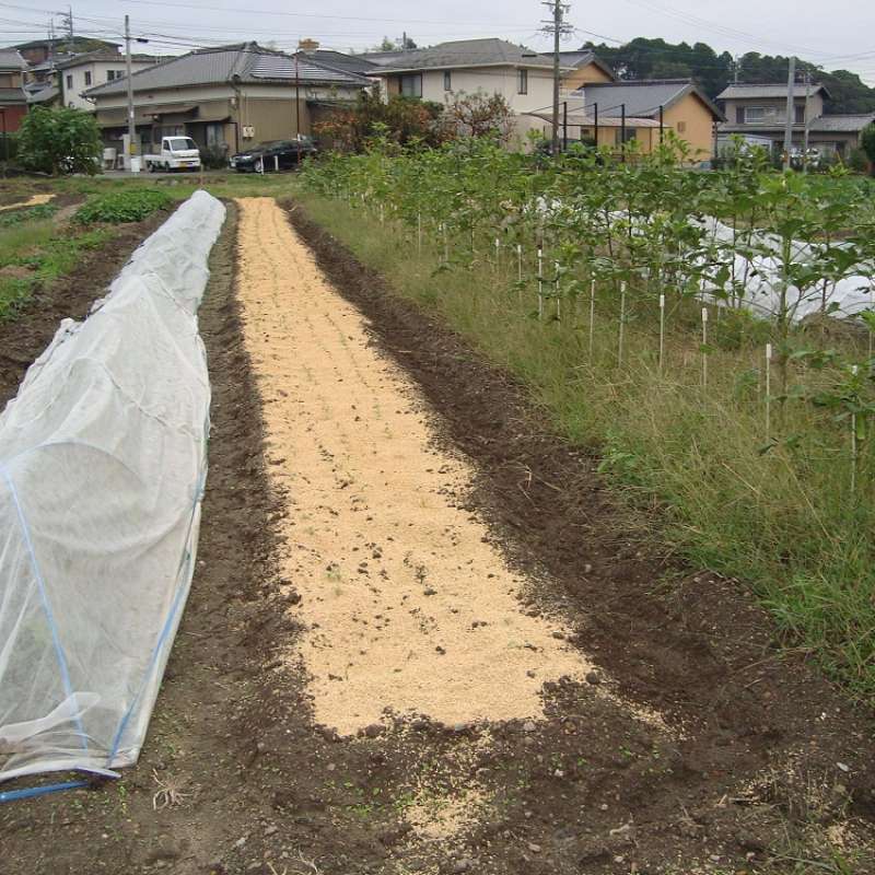 大根やカブの畝にモミ殻を撒きました。