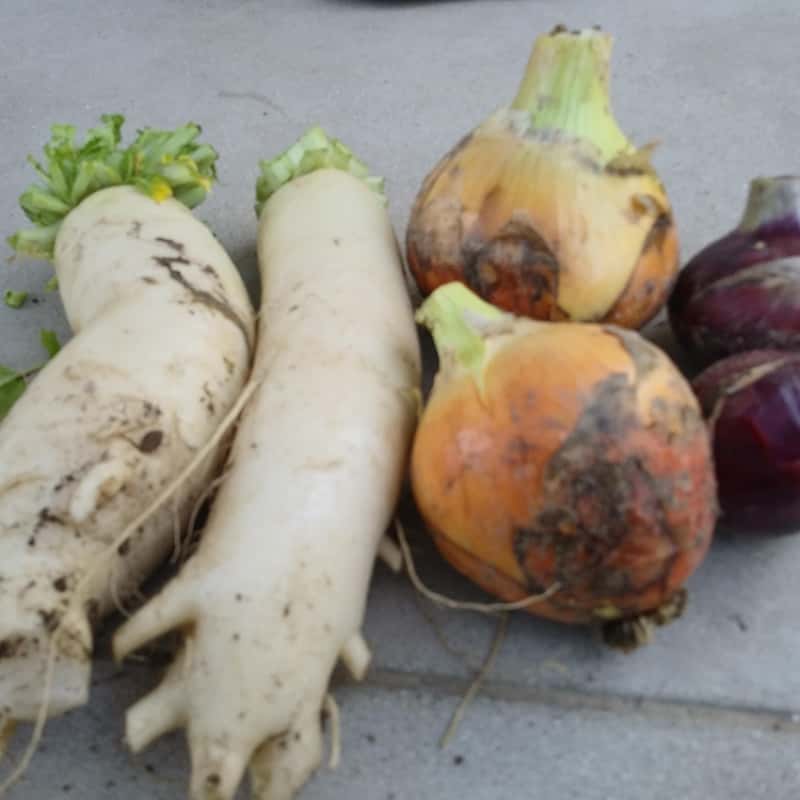 現在は玉ねぎ、じゃがいも、ニンニクを収穫してます。大根、八朔も残りわずかですがあります。