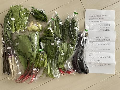 口コミを拝見し指名リクエストさせていただきました。除いて欲しい野菜や少量多品目等の要望を伝えると10品程になってしまうと返答がありそれでも大満足と思っていると13品も入っており驚き。日野菜かぶや花オクラは初めての野菜でこれから食べるのが楽しみです。どの野菜も生き生きとしていて新鮮さが窺えます。近くのスーパーでは緑の野菜ばかりだったのでカラフル野菜とても嬉しいです。野菜の説明とミニレシピの同封も有難いです。
