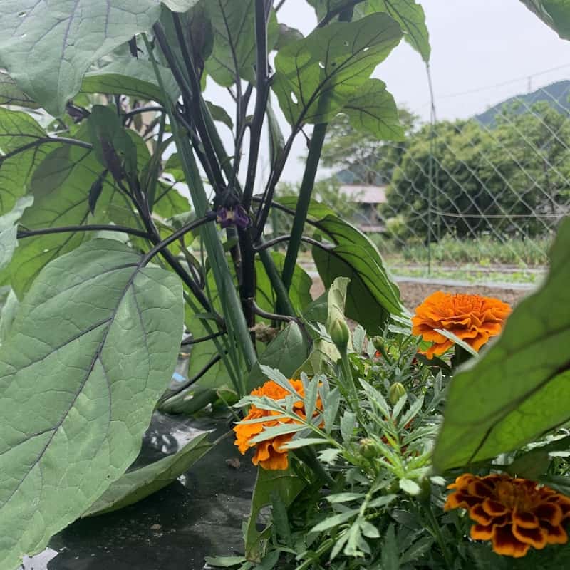 ナスに付きやすい病害虫を、ネギとマリーゴールドが守ってくれます。