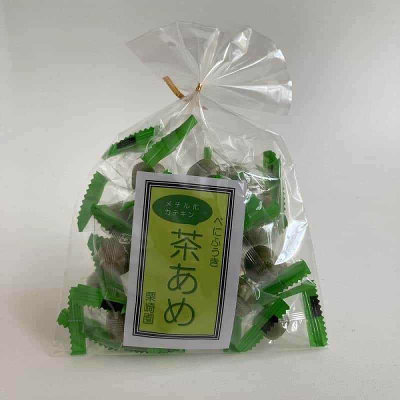 べにふうき茶の粉末をたっぷり練り込んだやや硬めのあめです。