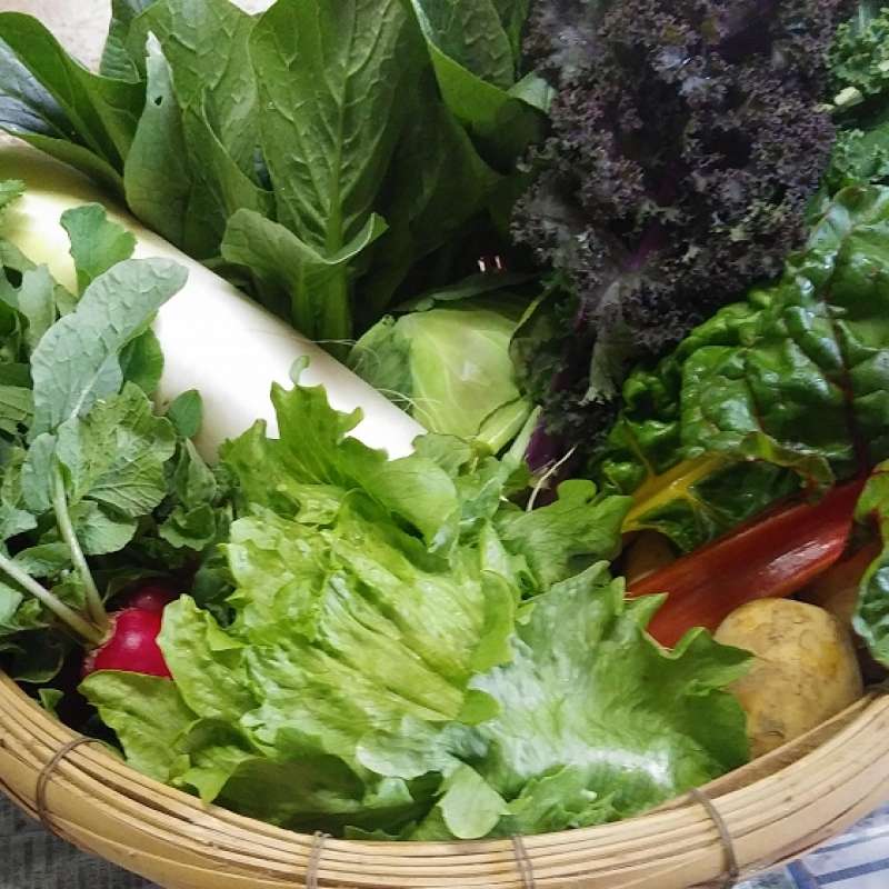 新じゃがいも、新玉ねぎ、にんじん、キャベツ、レタス、サニーレタス、フリルケールヴェルデ、フリルケールロッソ、パクチー、ゴーヤ、かぼちゃ、オクラ、ラディッシュ、タアサイ