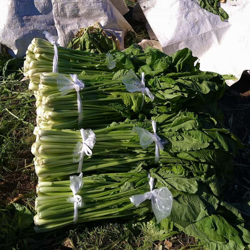 野沢菜栽培の大変なところは、収穫が一日中畑。手早く収穫出来るベテランだと1時間に15束くらい獲れたりしますが、不慣れだと5束とか・・・(^^;)