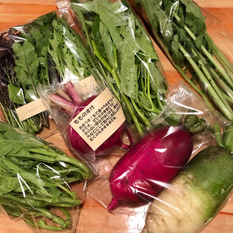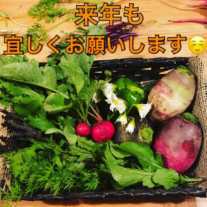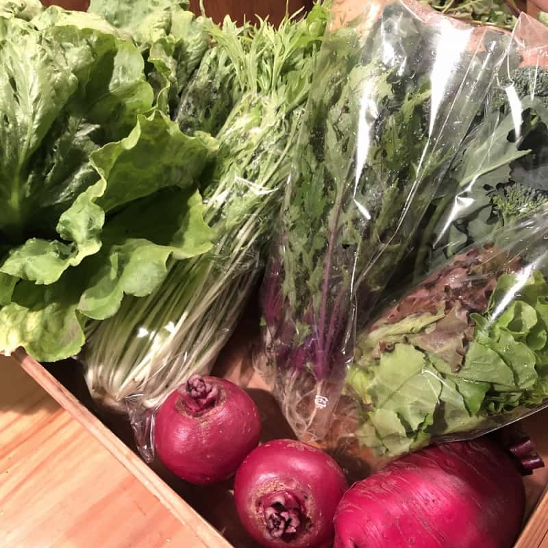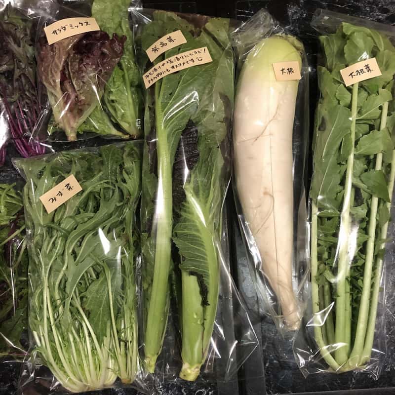 冬:春菊・水菜・高菜・カブ・赤大根・青長大根・黒丸大根・ベビーリーフミックス・ルッコラ・コーラルリーフ・にんじん・根深ねぎ・ブロッコリー・スティックセニョール・ビーツ・カボチャ・菊芋・山芋・生姜・葉にんにくetc