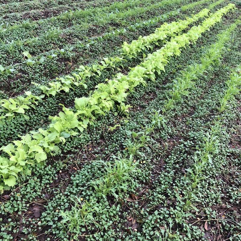 秋:黒丸大根・青長大根・紅心大根・赤大根・ラディッシュ・水菜・紫水菜・ルッコラ・コーラルリーフ・ベビーリーフミックス・サラダ小松菜・エンダイブ・チンゲンサイ・春菊・ほうれん草・フルーツカブ・山芋etc