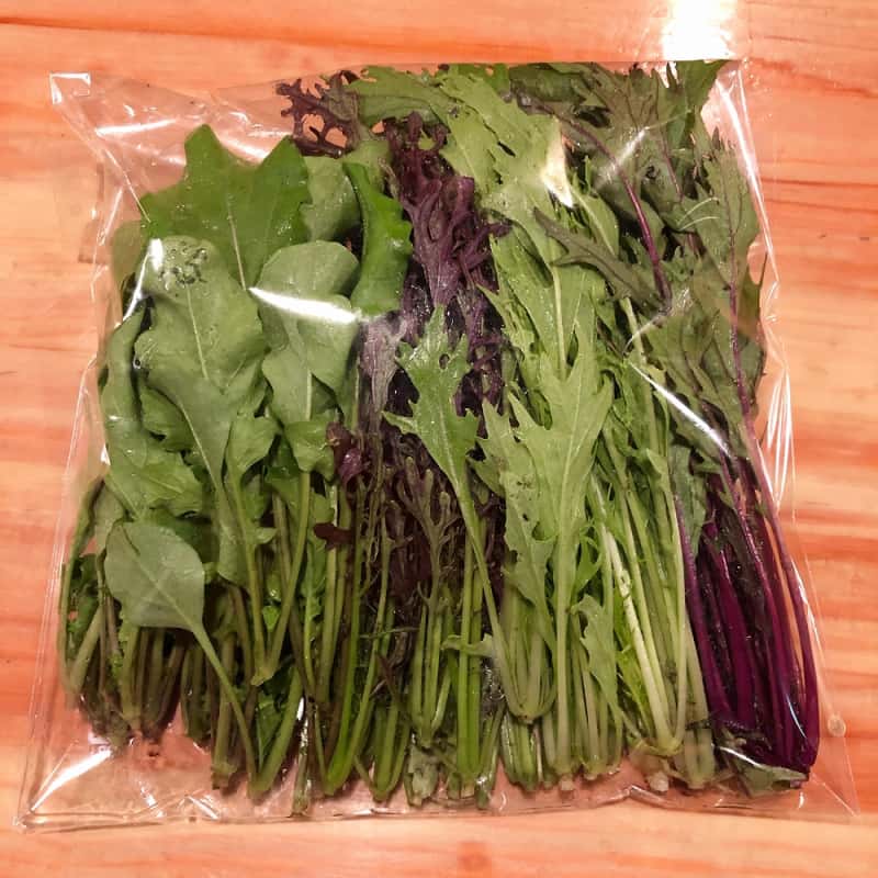 水菜、紫水菜、コーラルリーフ、わさび菜、からし菜、紫高菜、ルッコラ等