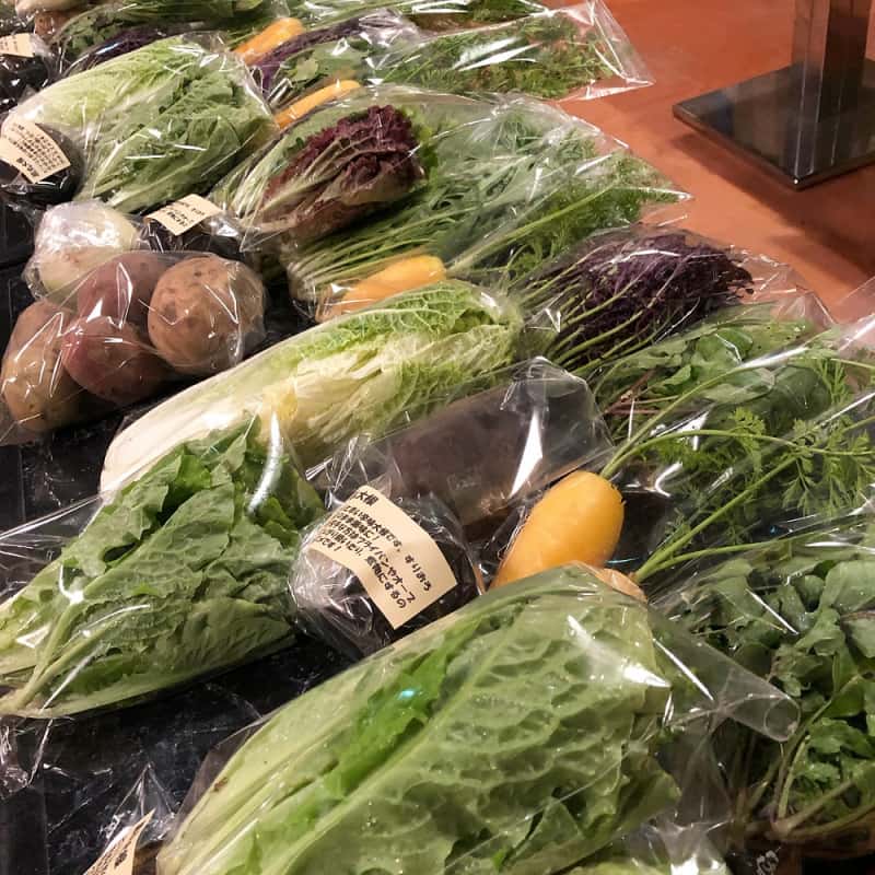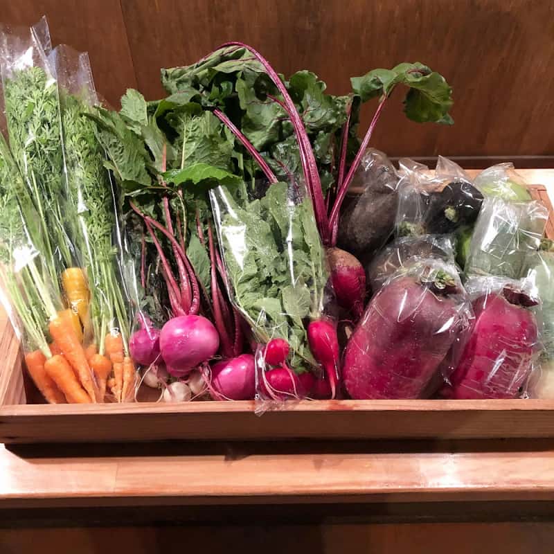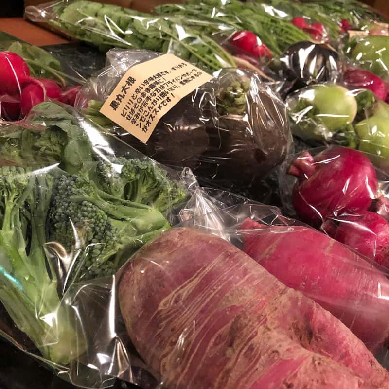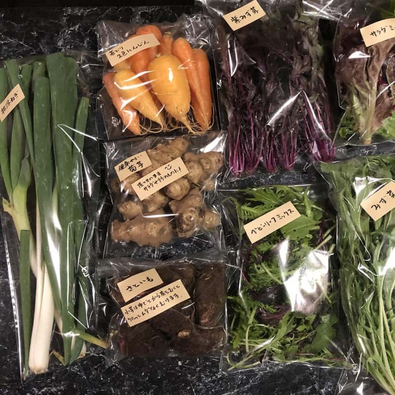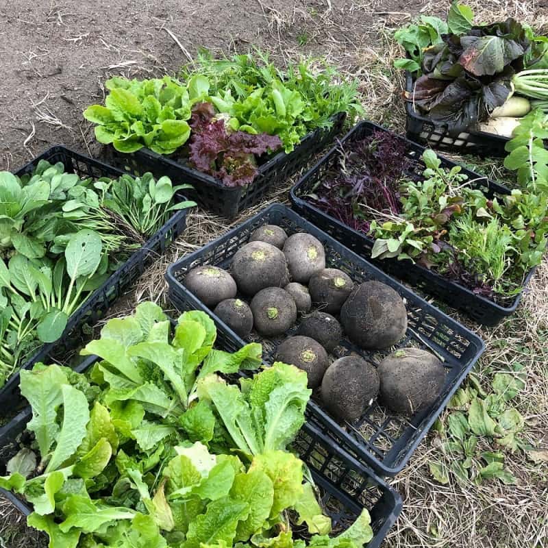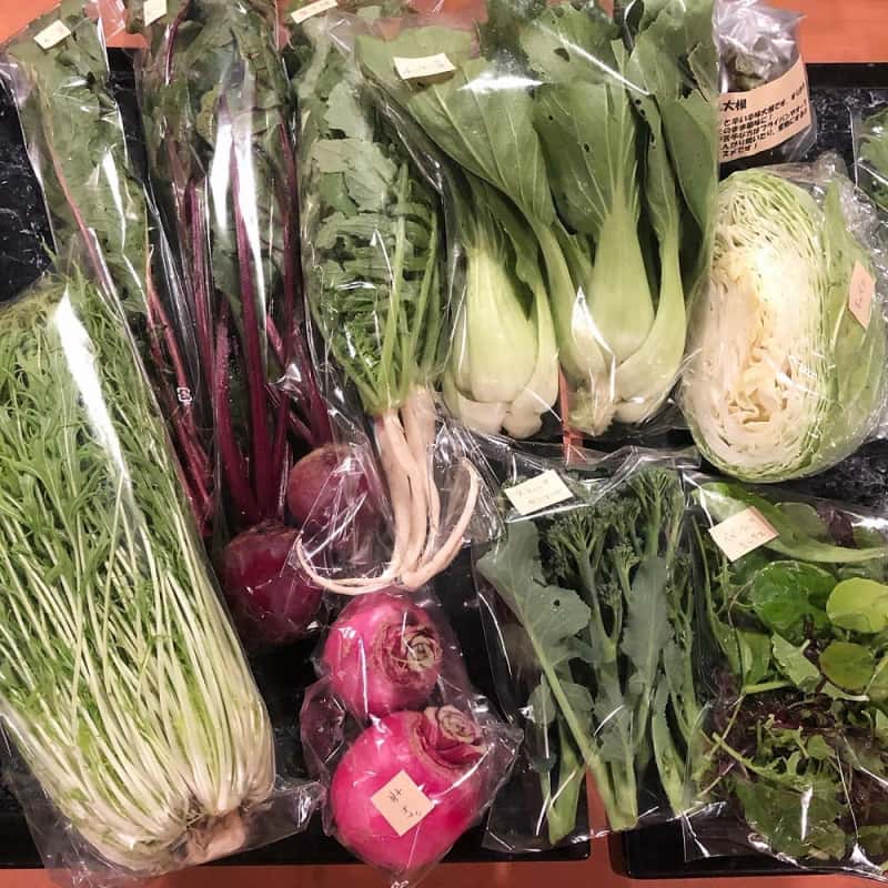 冬:春菊・水菜・高菜・カブ・赤大根・青長大根・黒丸大根・ベビーリーフミックス・ルッコラ・コーラルリーフ・にんじん・根深ねぎ・ブロッコリー・スティックセニョール・ビーツ・カボチャ・菊芋・山芋・生姜・葉にんにくetc