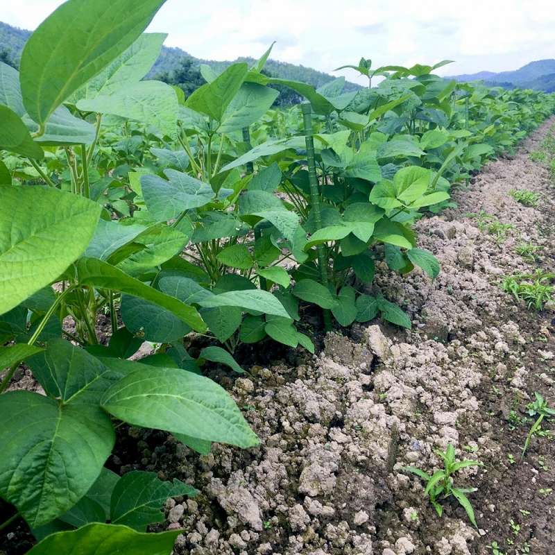 10月に収穫を迎える丹波篠山黒枝豆ですが、6月に植えた種豆は成長しただいま60cmほどに成長。
