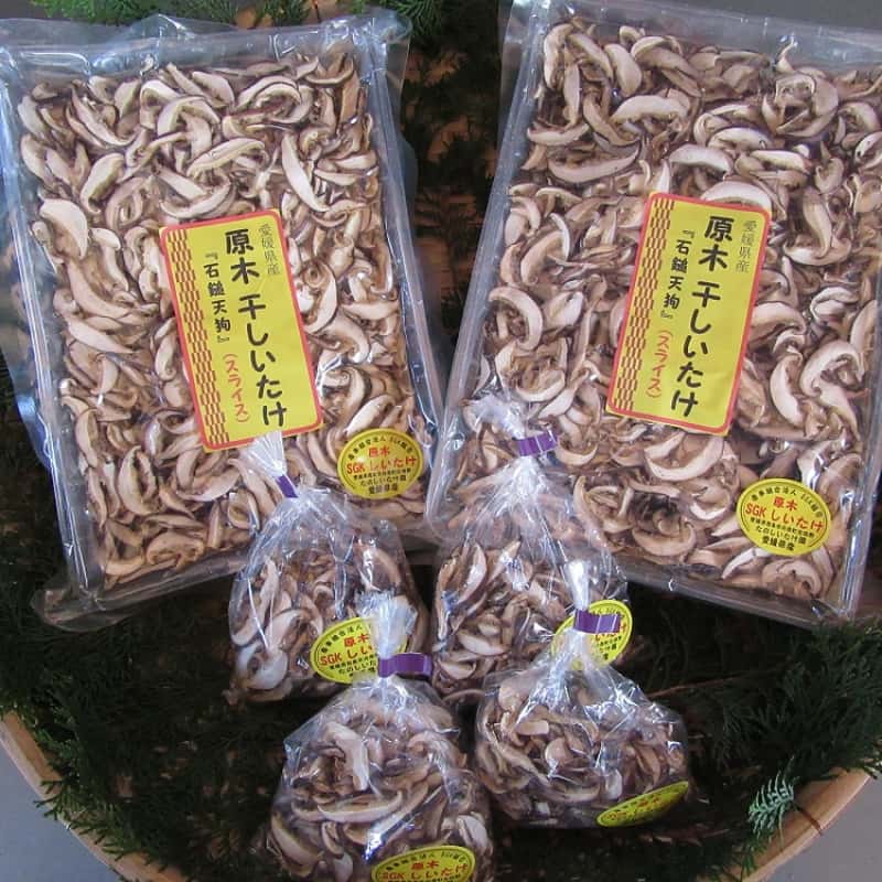 名水百選に選ばれた「うちぬき水」を使い、石鎚山のふもとで育った原木椎茸の「干しシイタケ(スライス)」です。
