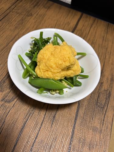旬のスナップエンドウはカリフローレなどどサラダにし、同じくいただいた人参と甘夏でドレッシングを作りました!