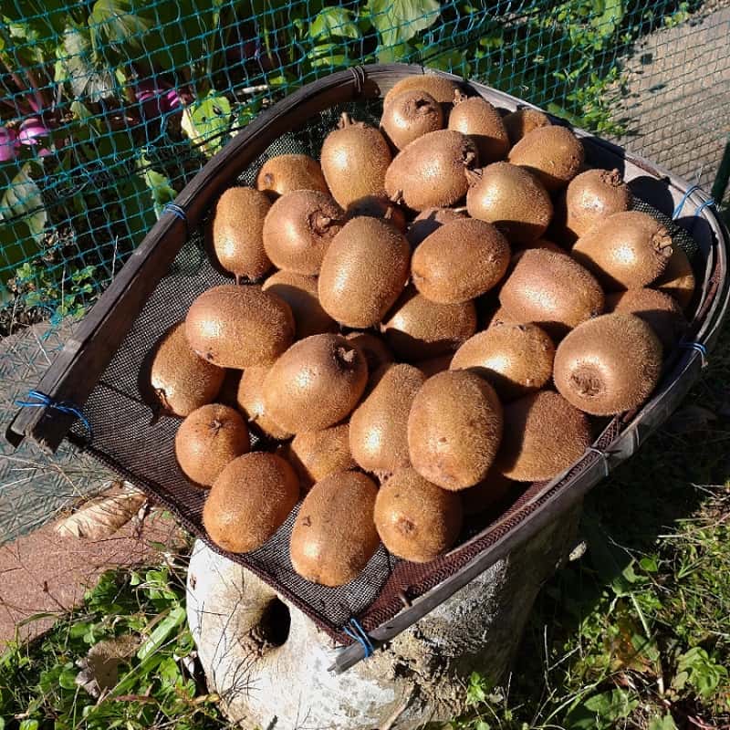 無農薬です。木では成熟しないので収穫してからリンゴと一緒に袋に入れ追熟します。