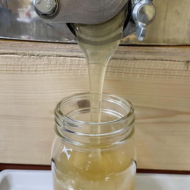 目の細かい布で濾し、蜜蝋、花粉などを取り除きます。