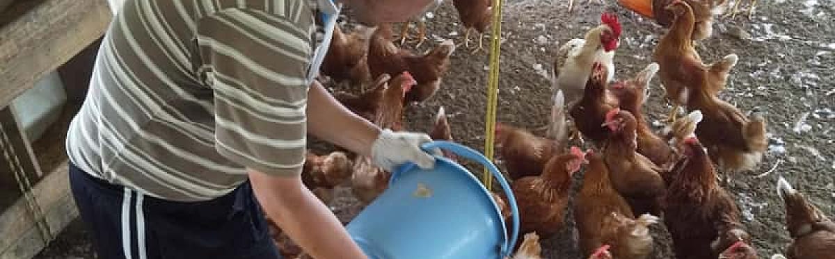 京都市左京区静市静原にある七彩の風。 緑豊かな自然の中で約800羽の鶏を飼育しています。 約20種類のエサを配合し、畑で採れた野菜のくずも与えています。