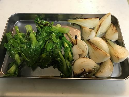 フライパンに、オリーブオイル大さじ1を入れ、葉玉ねぎと菜の花をキツめに焦げ目が付くまで炒めて香ばしさを出してトレーに!