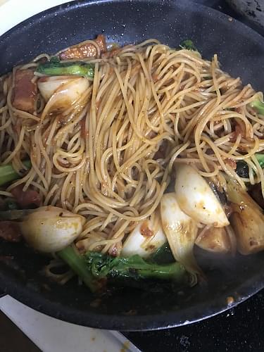 • 6 スパゲッティーの茹で時間を見ながら、4に、2のヤサイを加え温める。