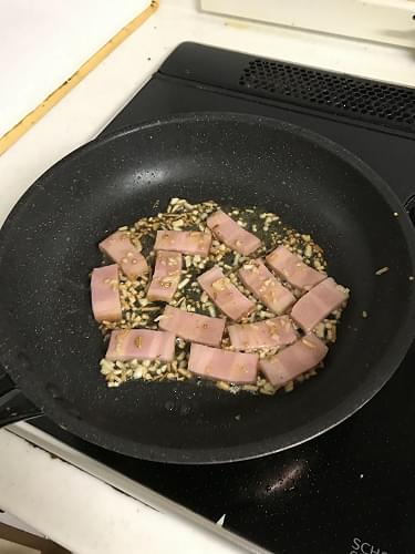 次にフライパンにオリーブオイル大さじ2を入れ、中火でニンニクを炒め香りが出たら、ベーコンを加えキツめに炒める。