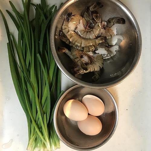 ニラ5cm、ニンニク1-2ミリにカットする。海老をむき、背割にする。卵に塩を小1入れ混ぜておく。※海老の殻は捨てない。
