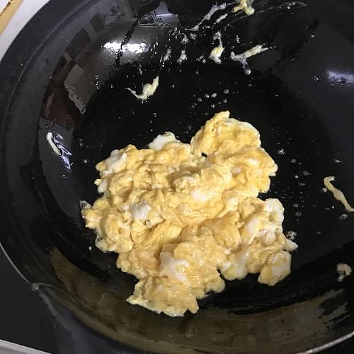 フライパンにサラダ油を大2入れ、煙が立つ位高温にし、卵を入れ手早く混ぜ半熟状態の炒り卵を作ってにボールに戻しておく。