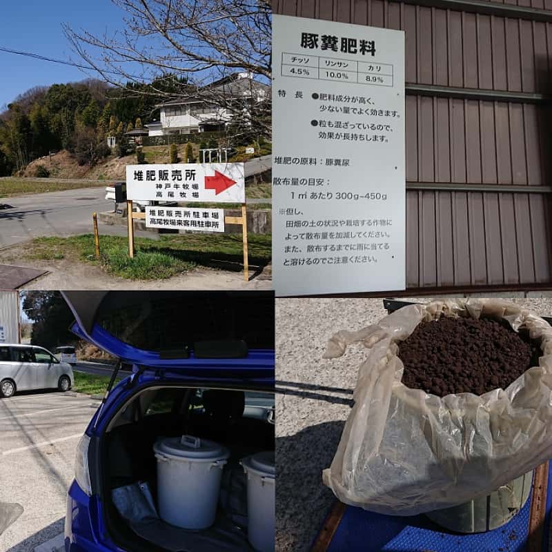 規模の小さな家庭菜園時代には神戸の畜産業者さんより豚糞を購入し福知山の畑まで運んでいましたが、規模を拡大した家庭菜園でも今年から豚糞も使うことにしました。