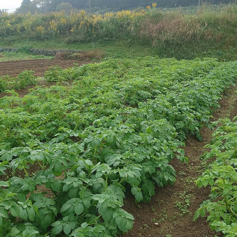 11月下旬までジャガイモの葉は画像のような緑色でしたが、12月初めの降雪で一気に枯れてしまい土に水気が残る中を慌てて収穫したところ、ジャガイモは泥だらけで付着した土は乾燥後も綺麗に落ちず出荷前日に水で洗い落とさざるを得ない羽目になってしまいました。