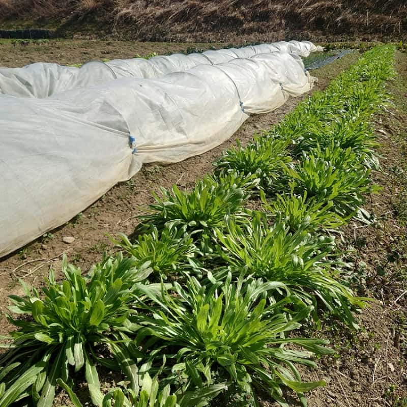 キャベツ、小松菜、チンゲンサイ等、虫の被害に遭いやすい葉物野菜は左の写真の通り防虫ネットで覆って育てるて無農薬栽培にこだわっておりますが、それでも虫に食べられたり、青虫等が付いていることがあり無農薬栽培の限界を感じており、被害のひどい場合に限り食品成分生まれの殺虫剤(写真右)を使用させていただいています。