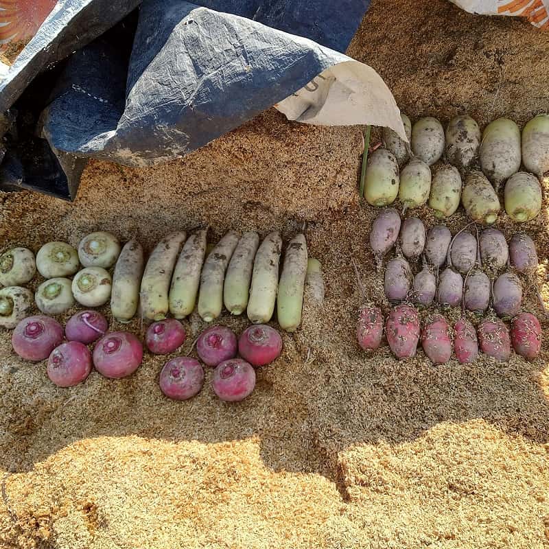 白菜には花芽が出始めておりカブ、大根のとう立ちも間近のため2/23に収穫し籾殻で覆って貯蔵しました。