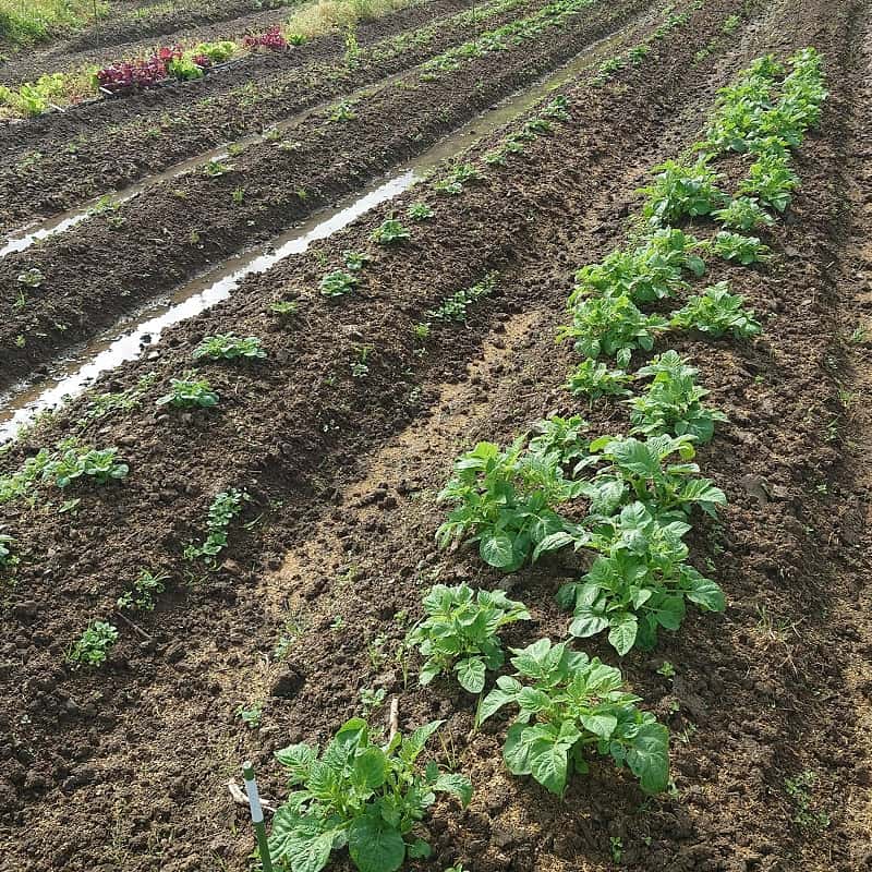 8種類(アンデスレッド、キタアカリ、グランドペチカ、シャドークイーン、男爵、ニシユタカ、ベニアカリ、メークイン)の種芋を植え付けたジャガイモ、品種毎にマチマチながら順調に芽が出揃いました。