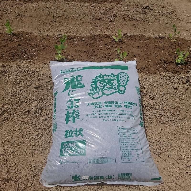 化学肥料の使用を少しでも減らすため、元肥料には地元養鶏業者さんの凄いネーミングの鶏糞『鬼に金棒』を惜しむことなく使用しております。