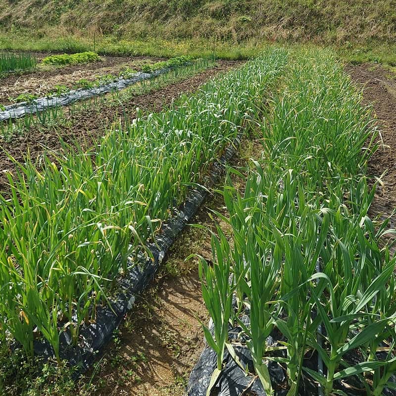 5品種(赤、ジャンボ、ホワイト6片、マイルドエックス、嘉定)栽培しているニンニクは順調に育っており嘉定は芽が出かけておりました。