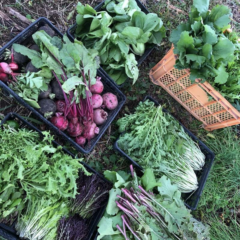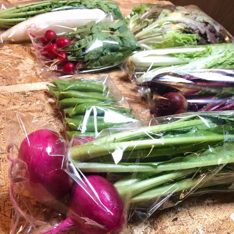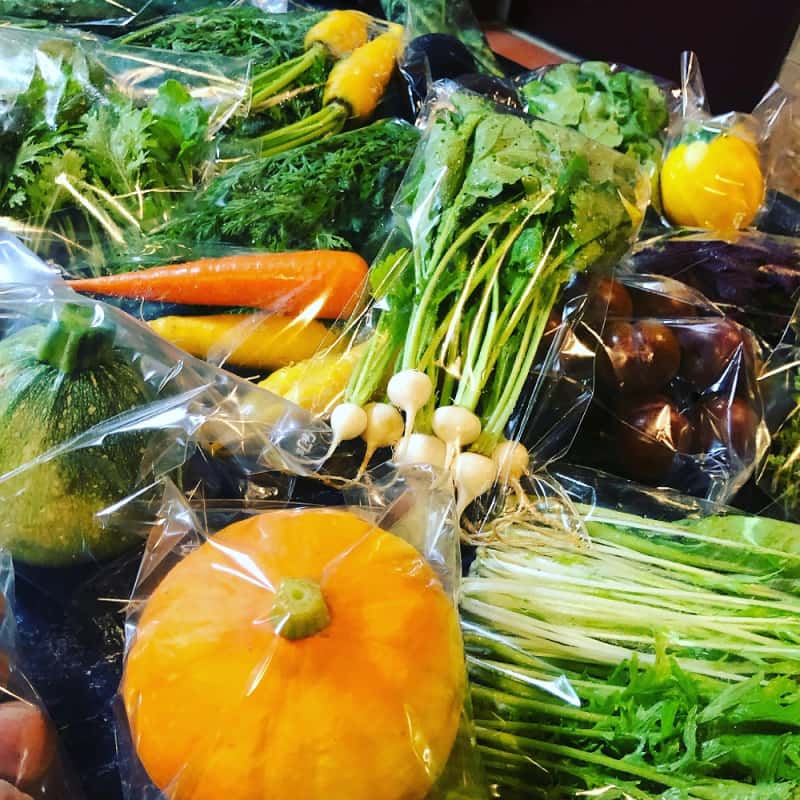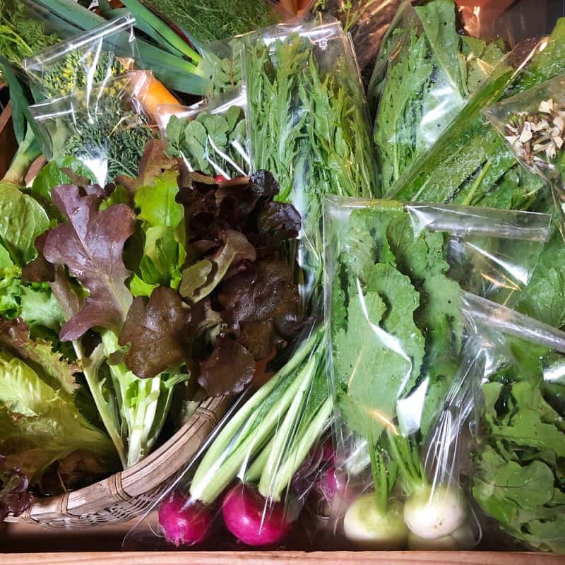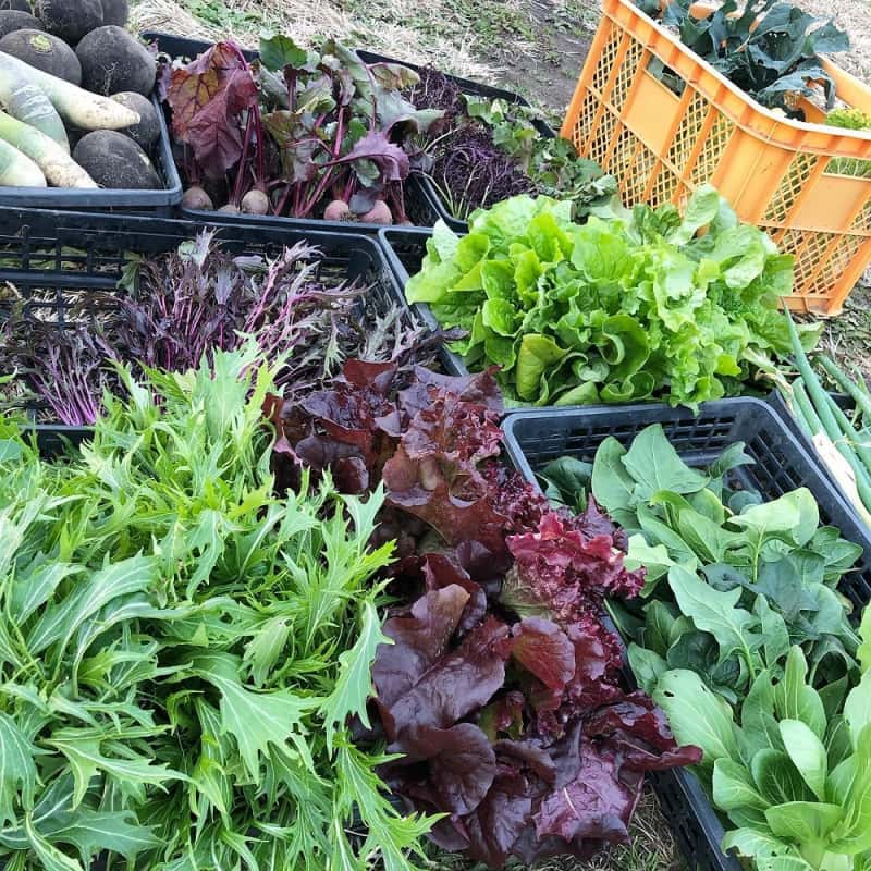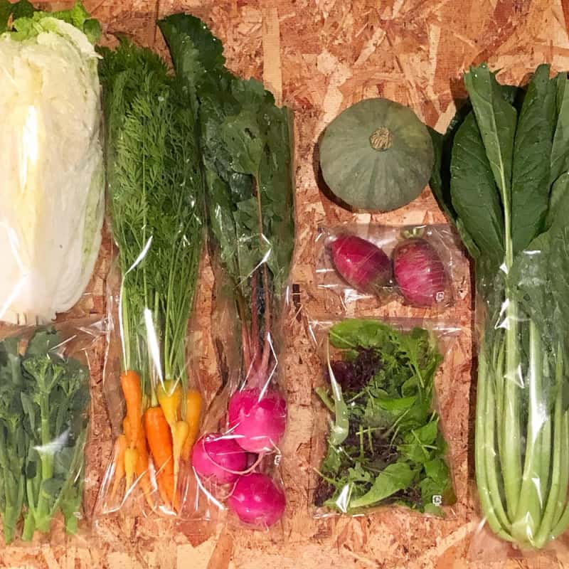冬:春菊・水菜・高菜・カブ・赤大根・青長大根・黒丸大根・ベビーリーフミックス・ルッコラ・コーラルリーフ・にんじん・根深ねぎ・ブロッコリー・スティックセニョール・ビーツ・カボチャ・菊芋・山芋・生姜・葉にんにくetc